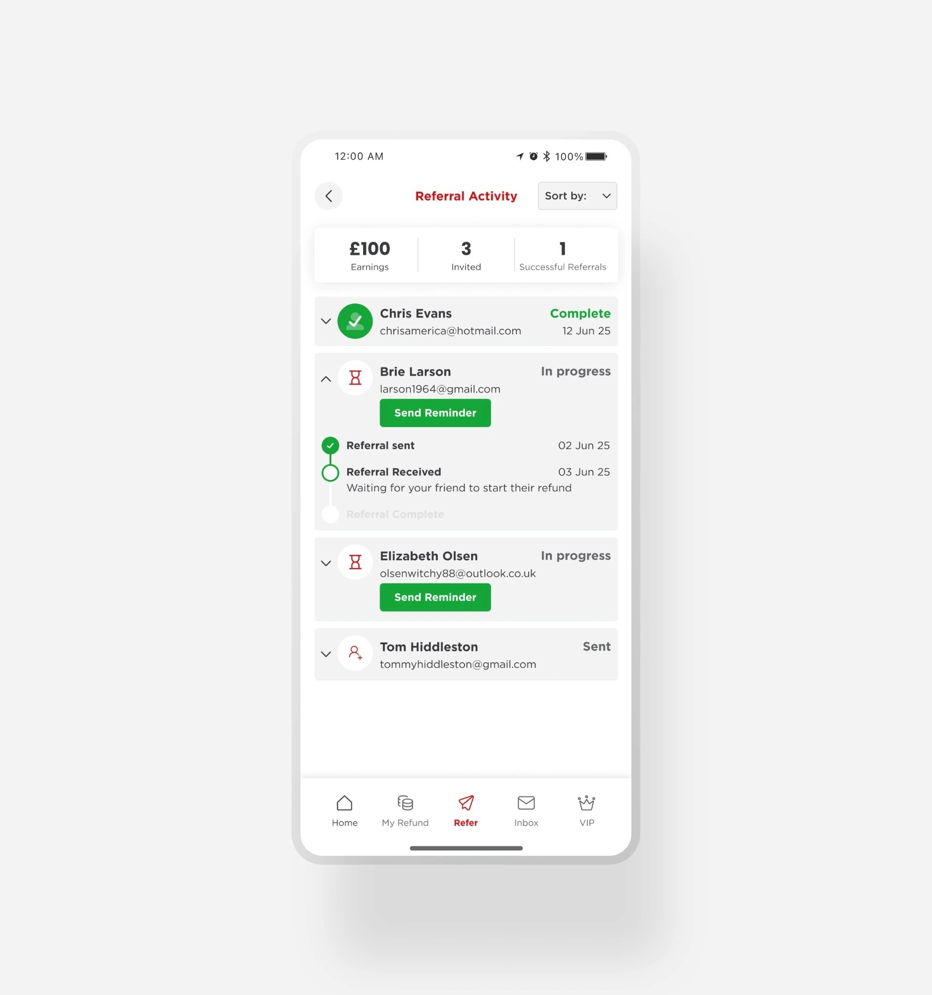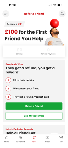 A tap on the “Referral Activity” button will let you know which of your friends have got back to us, which have started their refund and who already has their refund cash.